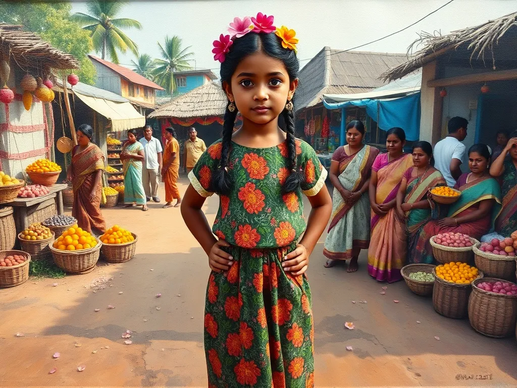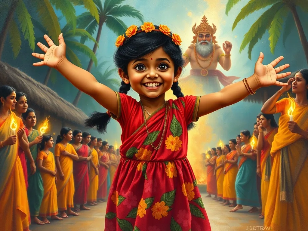 As dawn painted the sky with hues of orange and pink, Ammu remained transfixed by the magical pookkalam. It had continued to grow throughout the night, its intricate patterns evolving and shifting like a kaleidoscope. The flowers themselves seemed to breathe, their petals unfurling and closing in a rhythmic dance. As the first rays of sunlight touched the pookkalam, a figure began to materialize from its center. It was a shimmering being of pure light and color, a form woven from petals and vines, with eyes that sparkled like dewdrops on a spider's web. This was the Flower Spirit, the guardian of the pookkalam. Its voice, when it spoke, was like the gentle rustling of leaves in a summer breeze, a symphony of floral perfumes. "Greetings, Ammu," the Flower Spirit whispered, its voice laced with the fragrance of a thousand blossoms. "I am the guardian of this pookkalam, a gift and a test. It blooms only for those who remember the true meaning of Onam: kindness, compassion, and selfless giving." Ammu stared in awe, her shyness momentarily forgotten. "A test?" she asked, her voice barely a whisper. "What kind of test?" The Flower Spirit gently swayed, its petal wings fluttering softly. "Our world has begun to forget the values that King Mahabali held dear," it explained. "Greed and selfishness have taken root in the hearts of many. This pookkalam is a window, a connection to the spirit of Onam. But it will only continue to bloom if you can prove that kindness still exists in this village." The Flower Spirit then pointed to a section of the pookkalam. The petals had begun to wilt and fade, their vibrant colors turning dull and lifeless. "Look," the Spirit said sadly. "The pookkalam reflects the state of our world. As kindness diminishes, so does its beauty. The challenge before you, Ammu, is to revive its fading light. You must show the world that the spirit of Mahabali still lives on." Ammu, initially overwhelmed, felt a surge of determination rise within her. She knew that kindness existed in her village, but perhaps it had become hidden, overshadowed by the hustle and bustle of everyday life. She accepted the challenge. She would find a way to rekindle the spirit of Onam and restore the pookkalam to its former glory.