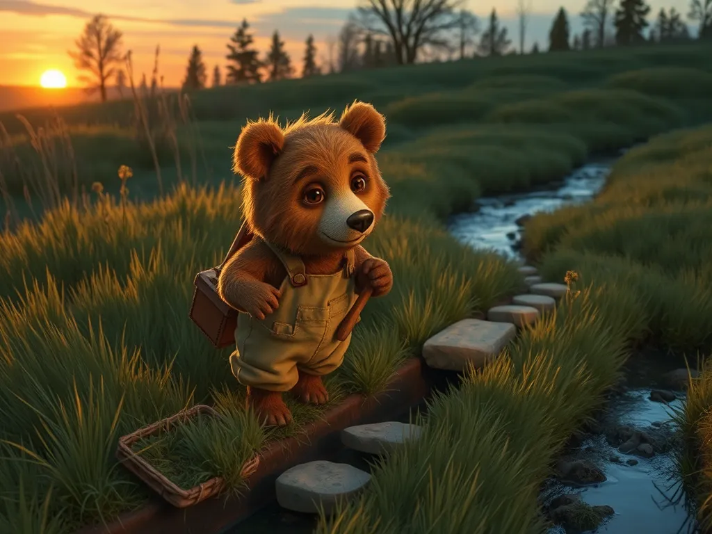 Barnaby returned home, his little head buzzing with ideas. Millie and Old Man Owl's advice gave him a plan. He remembered seeing a small stream a short distance away. He would need to create a system to channel the water to his blueberry bush. He collected some smooth, flat stones he found near the stream and, using his small tools, began to carefully dig a little trench. It was hard work, his small paws getting tired quickly. He had to patiently dig and avoid damaging any roots. He worked until sunset, painstakingly creating a narrow channel that sloped gently towards his blueberry bush. Finally, he placed the stones to line the trench, creating a pathway for the water to flow gently.