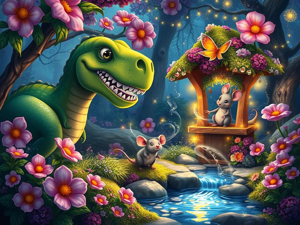 One sunny afternoon, I was feeling very lonely. I sat under my favorite giant mushroom, sighing sadly. "Why can't anyone be my friend?" I grumbled. A tiny voice squeaked, "Because you're too big and scary!" I jumped! There, on a mushroom cap, was Pip, the smallest field mouse I'd ever seen!