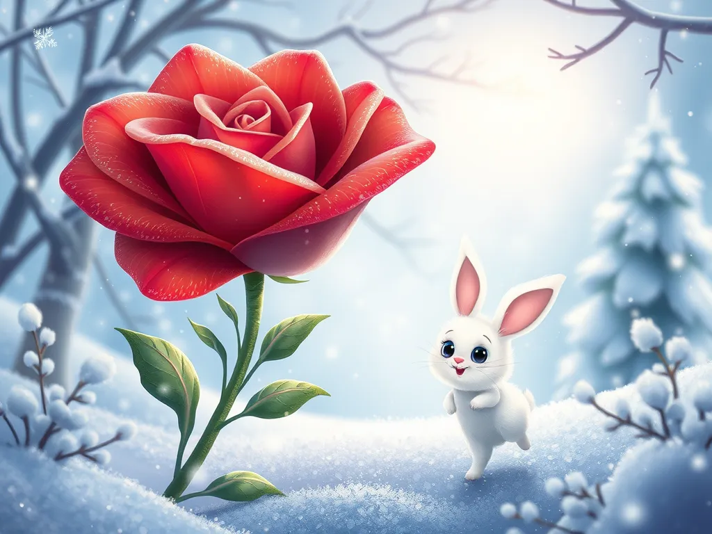 Dans un royaume recouvert de neige éternelle, vivait une petite rose nommée Rosée. Rosée était différente des autres fleurs. Elle ne fleurissait qu'en hiver. Elle avait de petites feuilles vertes foncées et un minuscule bouton rose pâle. Elle habitait dans un jardin secret, caché derrière le château de glace de la Reine Glacia. Un jour, un petit lapin blanc, Flocon, découvrit le jardin secret. Flocon était curieux et très gentil. Il vit Rosée. « Bonjour ! » dit Flocon. Rosée, surprise, répondit timidement : « Bonjour… ».