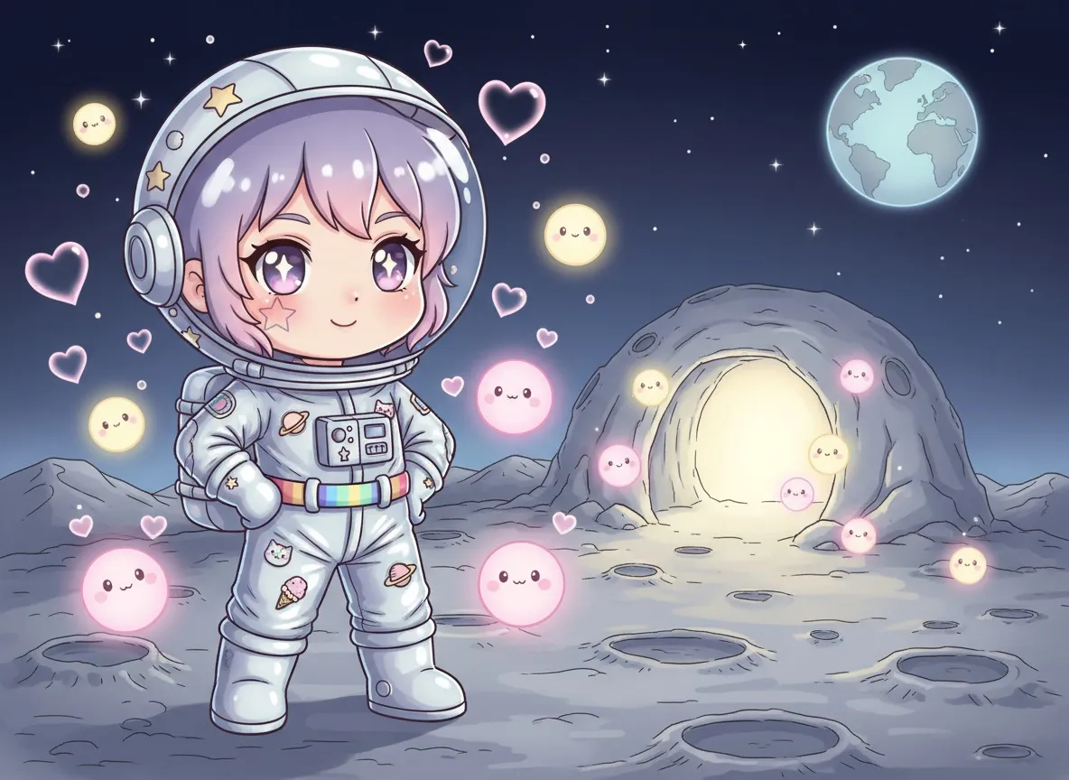 Bubbles the Nice, a young astronaut with a special sparkling power, journeys to the moon. After a soft landing, she discovers tiny, glowing moon creatures called Lunites who are lost and far from their sparkly homes. Using her unique power to create gentle light paths, Bubbles guides the wiggling Lunites across the moon's quiet surface, helping them navigate craters and hills. She eventually leads them to a luminous cave where their waiting families happily greet them. Bubbles feels happy and proud to have helped her new friends, understanding that kindness is a wonderful power as she prepares for her trip back home.
