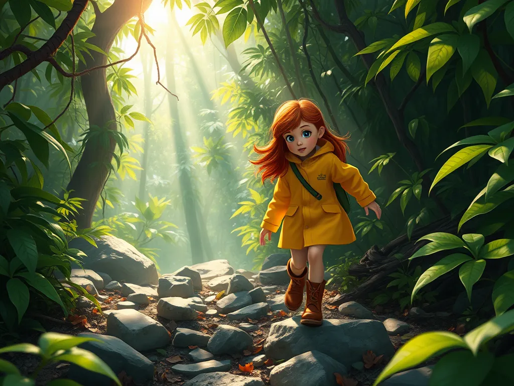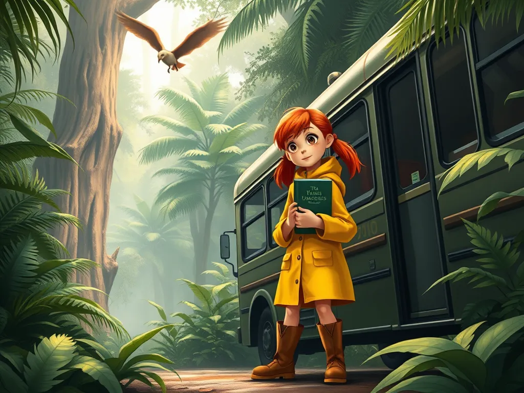 Maya, a ten-year-old with bright, curious eyes and a shock of fiery red hair, clutched her dinosaur fact book. She wore a bright yellow raincoat and sturdy boots, perfect for exploring Jurassic Park. The tour bus rumbled along a path lined with lush ferns and towering trees. Suddenly, a deafening roar shook the ground – a sound so powerful it made Maya’s teeth chatter. A tremor ran through the bus, bouncing it slightly. From the distant trees, panicked dinosaur cries could be heard echoing through the jungle. Maya, fearless and already an expert on dinosaurs, knew this wasn't part of the planned demonstration. Something was terribly wrong. Ms. Evans, the tour guide, her face pale, announced, '...we seem to have a slight...um… unexpected development. Apparently, the raptors have escaped their enclosure.' Panic swelled among the other tourists, children cried out, and adults scrambled for escape routes. A nearby Pterodactyl screeched overhead, its shadow passing swiftly over the bus. Maya knew escape wasn't simply a matter of running; the escaped dinosaurs were fast and dangerous. She began assessing the situation, her keen eyes scanning the surrounding vegetation, focusing on potential obstacles and routes. Thinking fast, she observed the raptors were heading towards a secluded area where the tour wasn't scheduled to go. That area contained a deep ravine, and her knowledge of prehistoric predators indicated they likely wouldn't cross it. This fact gave Maya an idea. This wasn't just a day of observing dinosaurs, it became a matter of survival.