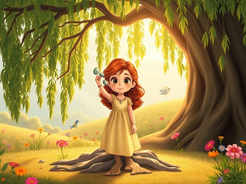 Lily carefully made her way down the winding staircase, her small feet padding softly on the stone steps. She arrived at the ancient willow tree, its branches draped towards the earth like gnarled fingers. The willow's leaves rustled gently, a sound like whispering voices. "Old Man Willow," Lily began, her voice small but clear, "the kingdom is quiet. The birds don't sing, and the flowers are sad. Can you tell me how to help?" The willow's branches swayed slightly, and then a voice, as soft as the breeze, answered, "The kingdom's heart is still. To free its song and the flowers' smiles, you must find the three lost melodies. They are hidden within the Sunstone Caverns, the Moonlit Meadows, and the Starlit Stream. Only when you reunite these three melodies will the kingdom awaken." Lily thought for a moment. The Sunstone Caverns were dark and scary, the moonlit meadows were far away, and she didn't like deep water. But she knew she had to try. "How do I find them?" she asked. the willow rustled, "Follow the path of the twinkling fireflies. They will show you the way. Find three shiny pebbles before the sun sets to guide you."